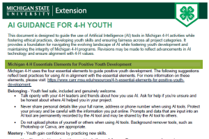 This document is designed to guide the use of Artificial Intelligence (AI) tools in Michigan 4-H activities while fostering ethical practices, developing youth skills and ensuring fairness across all project categories. -