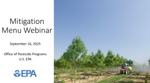 EPA's Office of Pesticide Programs led a webinar on protecting endangered species from pesticides using EPA's mitigation menu. The webinar included a review of EPA's mitigation calculators which allow growers to use different mitigation measures to meet their required mitigation totals.