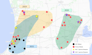 Redistribution efforts of an important natural enemy of brown marmorated stink bugs show signs of success. Over 27,000 samurai wasps have been reared and released across 34 sites in Michigan and we have a second year of evidence of overwintering success. -