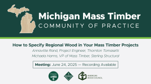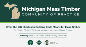 During this Michigan Mass Timber Community of Practice meeting, we have a presentation and conversation on what the 2021 Michigan building code means for mass timber, featuring expert Ed Lisinski, Midwest Regional Manager with American Wood Council.