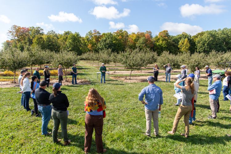 The day also included a tour of the 156-acre research farm managed by a dedicated farm staff. The site is densely planted with grapes, apples, blueberries, pears, cherries and other fruit crops to maximize research opportunities. Attendees rode a tractor-pulled trolley through the fields to see the plots firsthand and learned how trials and experiments are conducted on-site.