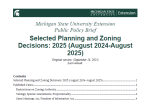 This public policy brief summarizes important court cases with rulings issued between August 2024 and August 1, 2025, in relation to planning and zoning in Michigan. -