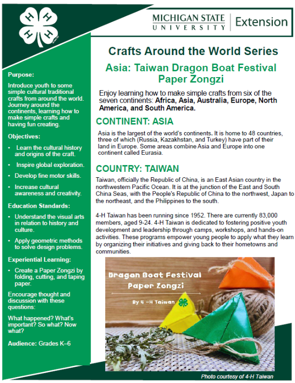 The activity was developed by Michigan State University Extension Educator Janis Brinn; Gao Xin-Mei (Joanna), IFYE Delegate; and Taiwan 4-H, 2023.