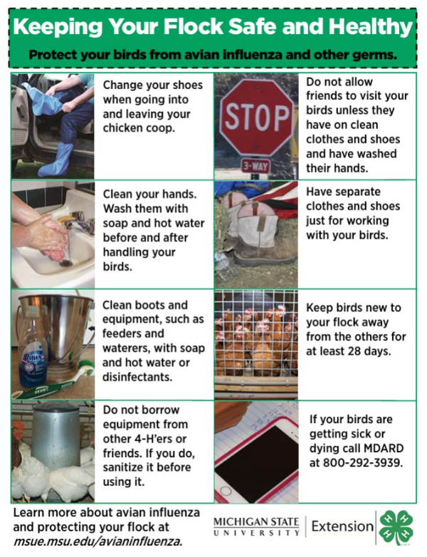 Printable biosecurity poster that outlines how to keep your flock safe and healthy, aimed at 4-H poultry owners.