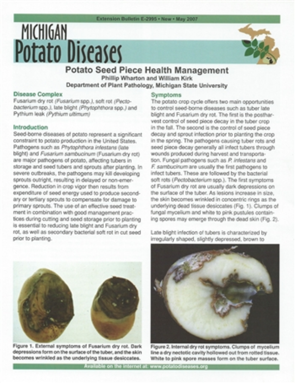 During recent growing seasons in Michigan, three factors have enhanced seed-borne disease problems: lack of the information on effective fungicides for both post-harvest and pre-planting use against seed-borne disease-causing pathogens (e.g., P. infestans and F. sambucinum); an increase in the area of potatoes grown by fewer growers, leading to management issues such as timing of precutting of seed; and climatic factors such as increased frequency of rain events during planting. In combination, these factors can delay planting and increase the impact of seed-borne diseases during the early portion of the growing season, and subsequently may affect yield and quality of the crop.